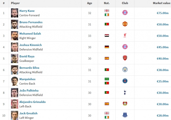 10月15日讯 昨日德转更新德甲球员身价,32岁的凯恩身价没有变化,仍为7500万欧。尽管身价没有提升,凯恩在现役30岁以上球员的身价排行中仍断档领先。