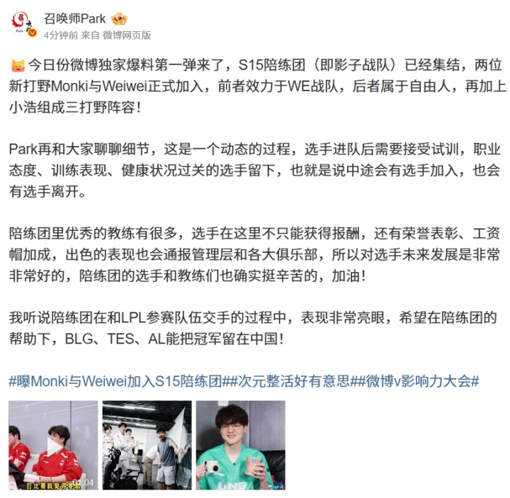 10月16日讯 今日爆料人表示,两位新打野Monki与Weiwei正式加入S15陪练团,和小浩组成三打野阵容,但为提及WBG。
