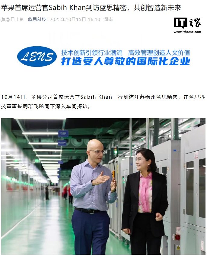10 月 16 日消息,10 月 10 日,有报道称苹果前首席运营官(COO)杰夫・威廉姆斯(Jeff Williams)将于 2025 年底正式退休,其职位已交由萨比・汗(Sabih Khan)接任。10 月 14 日,这位新任首席运营官已经到访中国供应商瑞声科技、蓝思精密等。