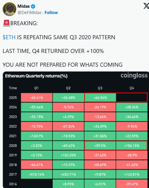 Midas在周一的X帖文中表示:"ETH正在重复2020年第三季度的相同模式。"他补充说,上一次出现这种表现后,第四季度收益超过了100%。