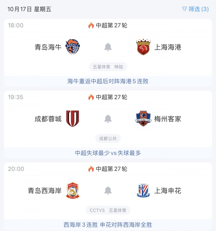 今天晚上中超前三相继出战。海港和蓉城对阵保级压力巨大的海牛和梅州,申花则要挑战西海岸。