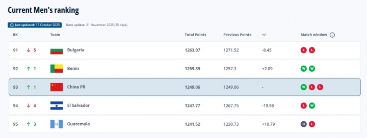 10月17日讯 FIFA更新男足国家队排名,10月国家队比赛日没有集训的中国男足排名上升一位,从第94位升至第93位。