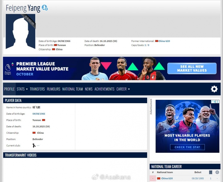 根据广东女篮的官方公告,女篮队员杨力维、杨舒予的父亲,前男足国青队、云南足球队球员杨飞鹏于昨日凌晨去世,享年59岁。杨飞鹏出生于1966年8月4日,曾于上世纪80年代入选中国国青队参加1985年苏联世青赛,在小组赛与巴拉圭的比赛中替补出场。那届国青队最终在八强战被东道主苏联1-0淘汰,是国青历史上的最好成绩。同年早些时候,杨飞鹏还随国青获得了亚青赛的冠军(出场记录未知)。