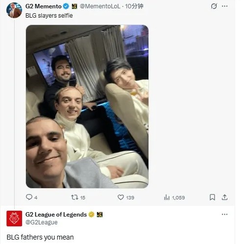 G2官推评论教练赛后自拍:你是说BLG的父亲们吗?