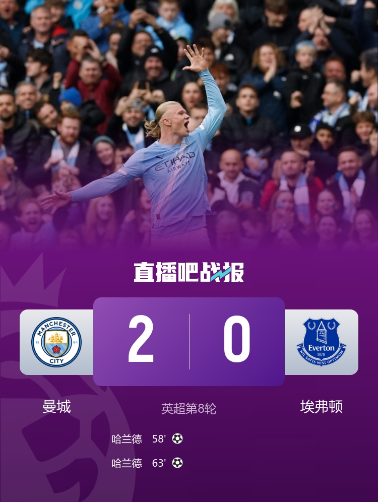 英超联赛第8轮,曼城2-0战胜埃弗顿,哈兰德梅开二度,福登策动两球。