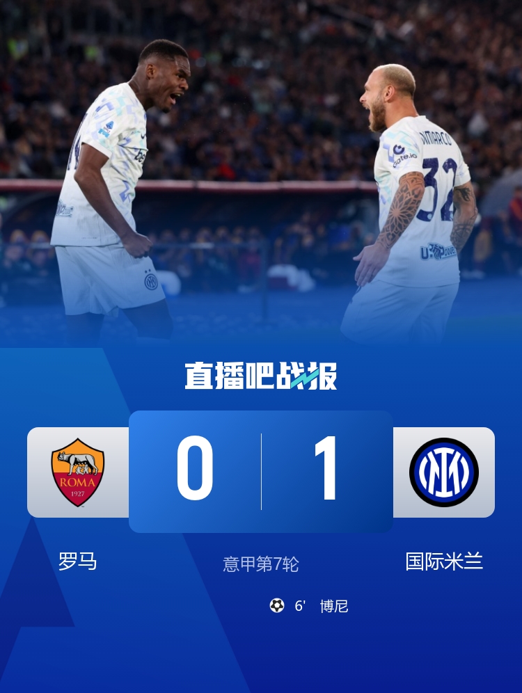 意甲第7轮,国际米兰1-0客胜罗马,博尼制胜。