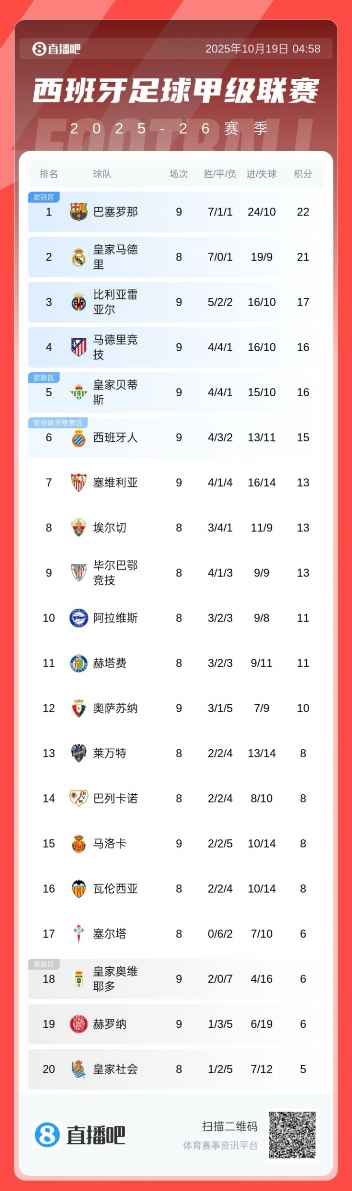 终于挤进前4!西甲积分榜:马竞8轮不败升第4,巴萨1分优势暂登顶