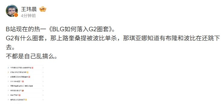 10月19日讯 媒体人王玮晨发文吐槽B站热搜词条“BLG如何落入G2圈套”: