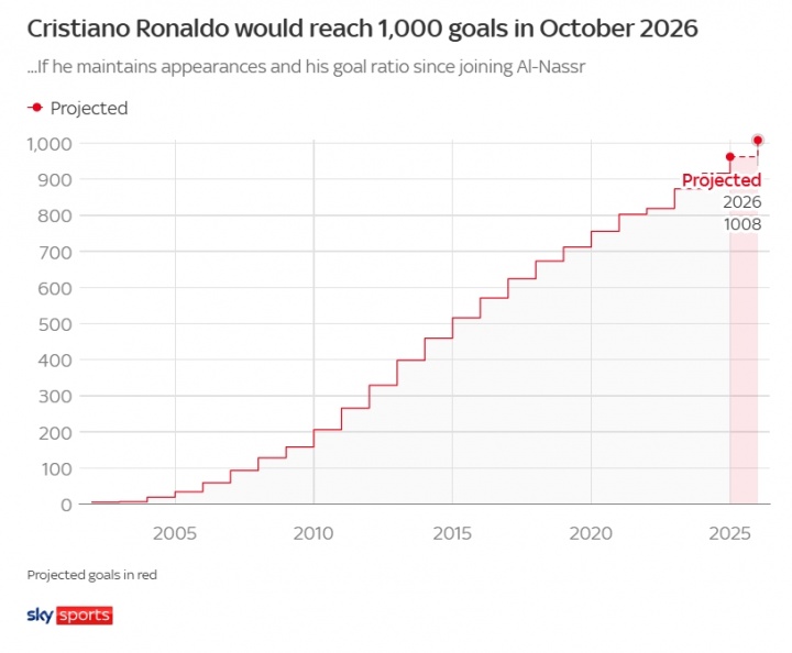 天空体育最近的预测显示,根据C罗目前的进球效率,他预计将在2026年10月成为历史上第一位进球数达到1000的球员。