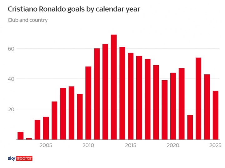 2025年,C罗已经在俱乐部和国家队攻入32球,自2010年以来,C罗平均每年进球数超过50个,过去15年里,他的年度总进球数只有一次低于39个。那是在2022年,那一年他攻入了16粒进球。