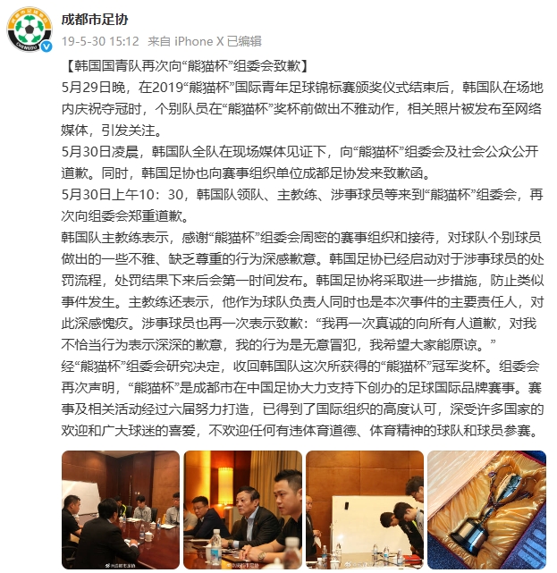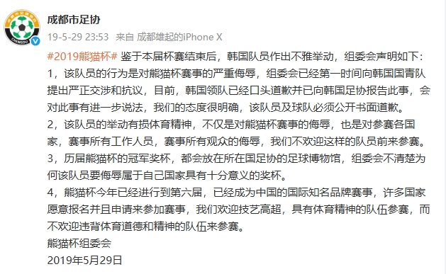2019年熊猫杯,韩国国青最后一轮3-0战胜中国国青,三战全胜夺得冠军。颁奖仪式后,韩国球员朴规现脚踩奖杯做出不雅动作,相关照片被发布至网络媒体,引发广泛关注。最终,韩国队公开进行,赛事组委会宣布,收回韩国队获得的“熊猫杯”冠军奖杯。