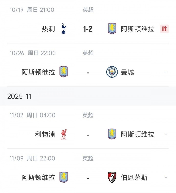 维拉摆脱了赛季初的低迷之后,现在正是状态火热之时。接下来维拉将在欧联杯对阵弱旅前进之鹰和特拉维夫马卡比,不过他们这期间的三轮英超,将挑战积分榜的2/3/4名:曼城、利物浦和伯恩茅斯。