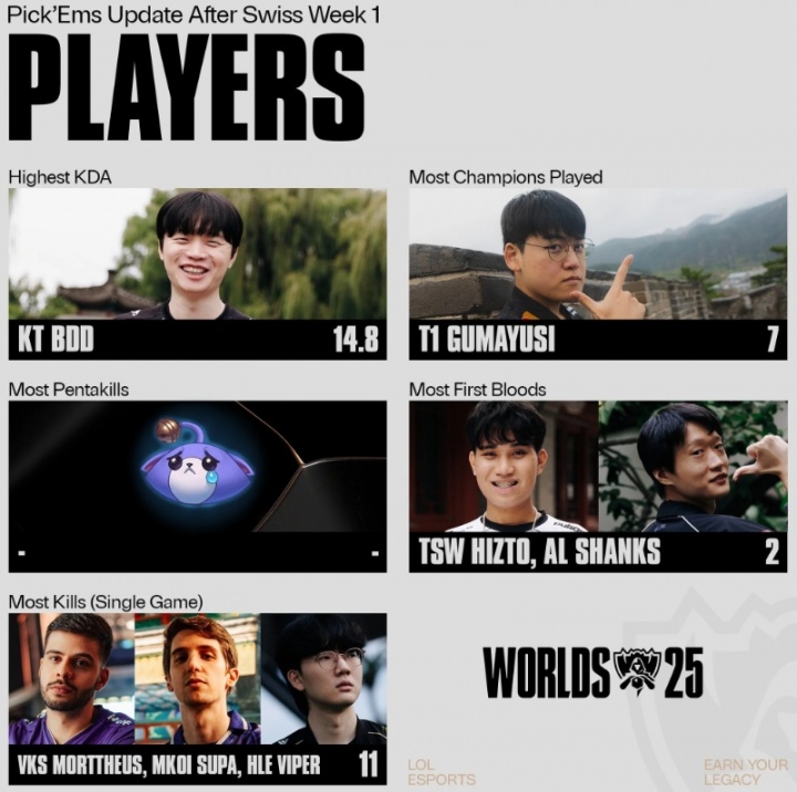 10月20日讯 LOL赛事官方分享瑞士轮至今选手数据。