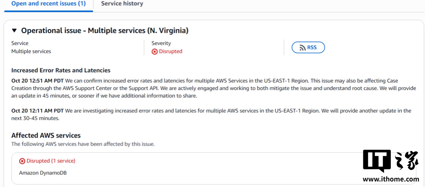 注意到,根据亚马逊 AWS 健康状态页面公布的信息,亚马逊确认美国东部区域内的多个 AWS 服务出现错误率增加和延迟,Amazon DynamoDB 数据库服务中断。