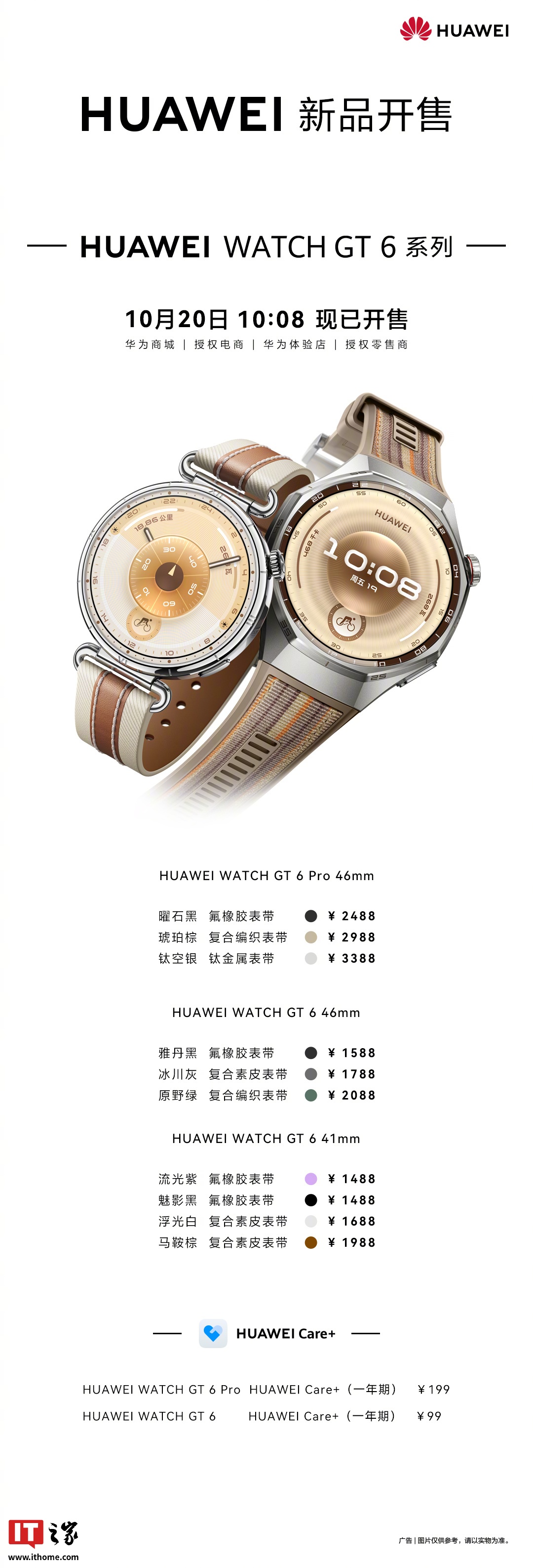10 月 20 日消息,华为终端官方今日宣布,华为 WATCH GT 6 系列智能手表开售,新表搭载玄玑感知系统、支持支付宝碰一碰支付、星闪车钥匙,售价 1488 / 2488 元起。