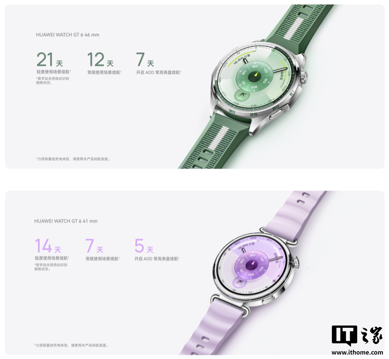 HUAWEI WATCH GT 6 标准版提供 41mm 和 46mm 两种尺寸,满足不同佩戴需求。41mm 版本引入回环型灵动表耳、精致表冠,配备 1.32 英寸屏幕,续航最长 14 天。46mm 版本采用升级的高硅堆叠电池,容量比上一代提升 65%,配备 1.47 英寸屏幕(3000 尼特峰值亮度),续航可达 21 天。
