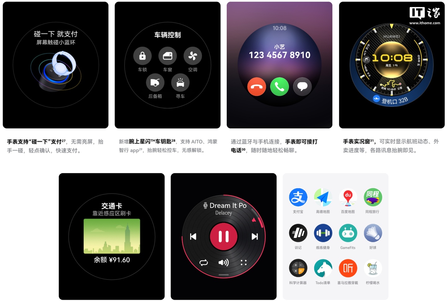 HUAWEI WATCH GT 6 智能手表还支持支付宝碰一碰支付、腕上星闪车钥匙、蓝牙接打手机电话、手表实况窗、交通卡、音乐播放、第三方 App 安装使用等。