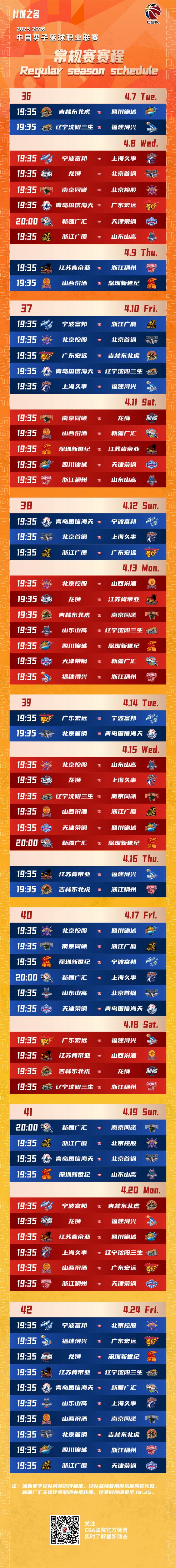 10月20日讯 CBA官方公布新赛季赛程,常规赛共42轮。比赛将于12月12日19:35开打,揭幕战为广厦VS山西(上赛季常规赛前二)。以下是赛程的详细情况: