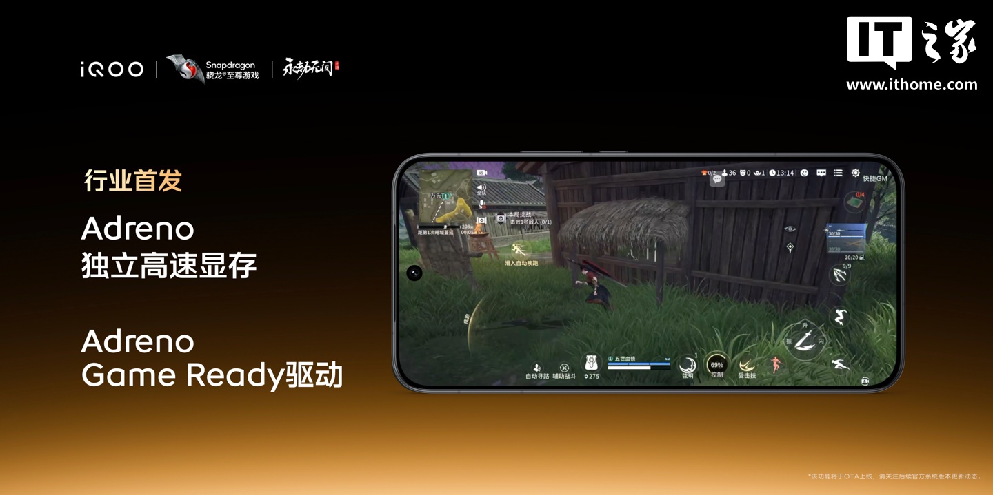 10 月 20 日消息,iQOO 15 跨代领先发布会正在进行中,iQOO 手机官方宣布,iQOO 15 搭载第五代骁龙 8 至尊版处理器,首发独立高速显存和 Game Ready 手游驱动:全面落地《永劫无间》手游、《崩坏:星穹铁道》率先实装独立高速显存。