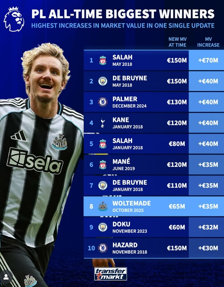 英超历史单次身价涨幅榜:萨拉赫+7000万欧居首,沃尔特马德在列