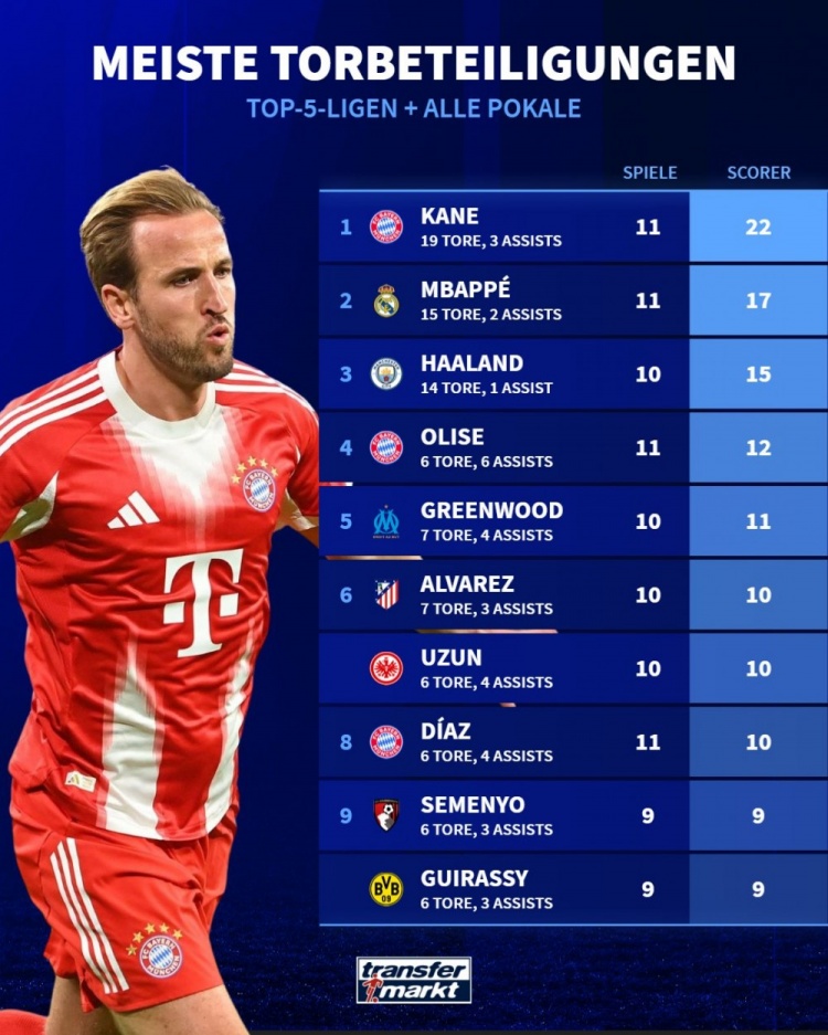 10月20日讯 《转会市场》统计了本赛季五大联赛球员在俱乐部各项赛事的直接参与进球总数情况,凯恩、姆巴佩、哈兰德分列前三。