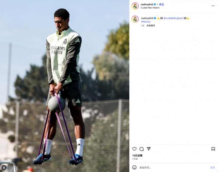 10月21日讯 皇马近日在官方社媒发布了一张贝林厄姆的训练照,迅速走红,点赞数高达78万次。
