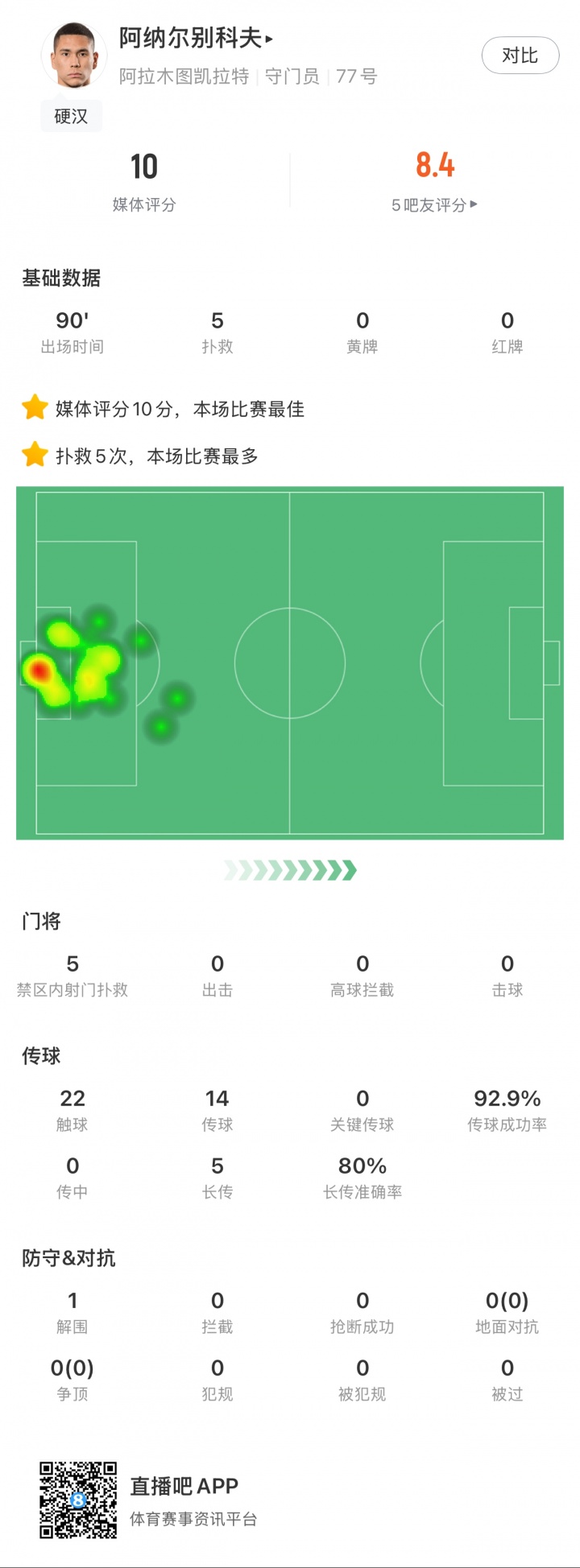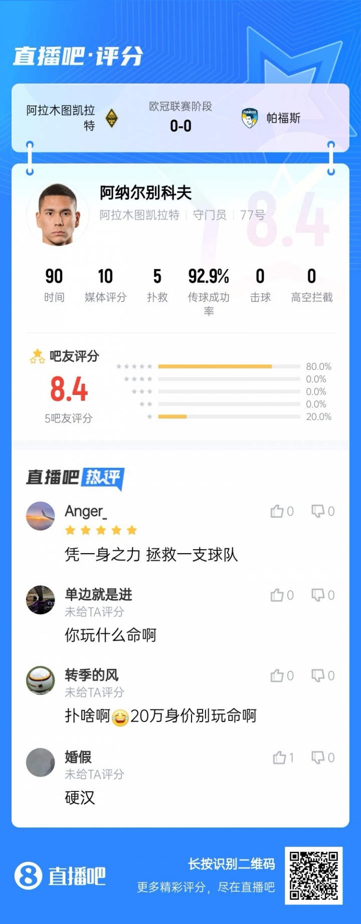10月22日讯 欧冠联赛阶段第3轮,阿拉木图凯拉特主场0-0战平十人帕福斯,主队的哈萨克斯坦门将阿纳尔别科夫5次扑救获评10分满分!