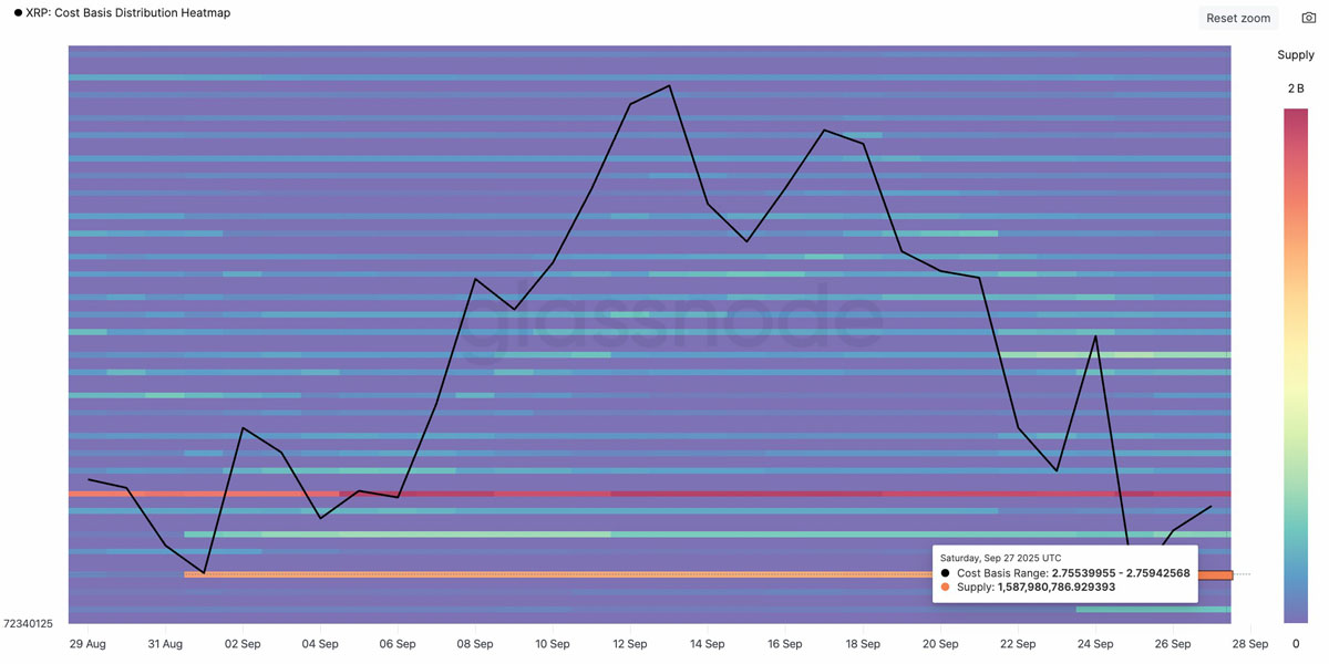 Glassnode分布热图显示,2.75美元附近存在大量需求集群,约有15.8亿枚XRP在此价位被购入,进一步凸显了这一水平的重要性。