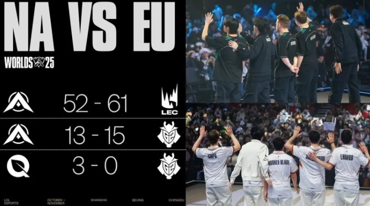 10月22日讯 外媒晒NA与EU历史战绩,具体对阵数据如下: