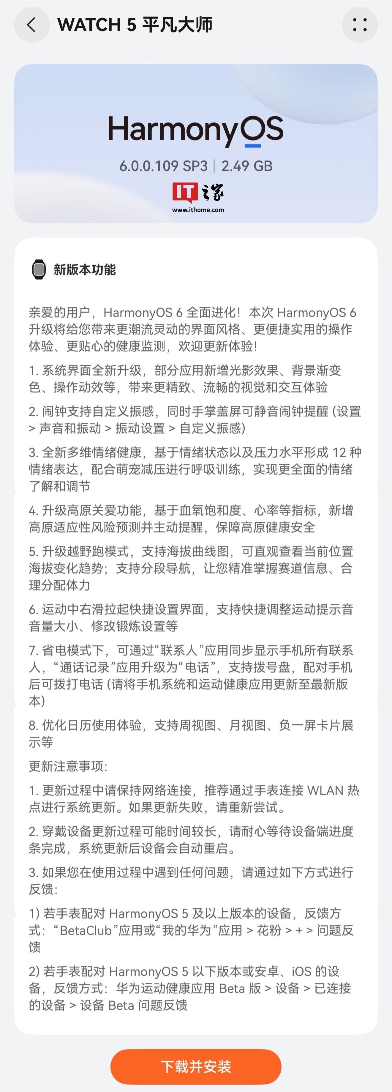 10 月 23 日消息,据用户反馈,华为 WATCH 5 系列智能手表已开启鸿蒙 HarmonyOS 6 花粉 Beta 版本(版本号:6.0.0.109 SP3)升级推送,系统包大小约 2.49GB,升级高原关爱功能、越野跑模式、系统界面等。