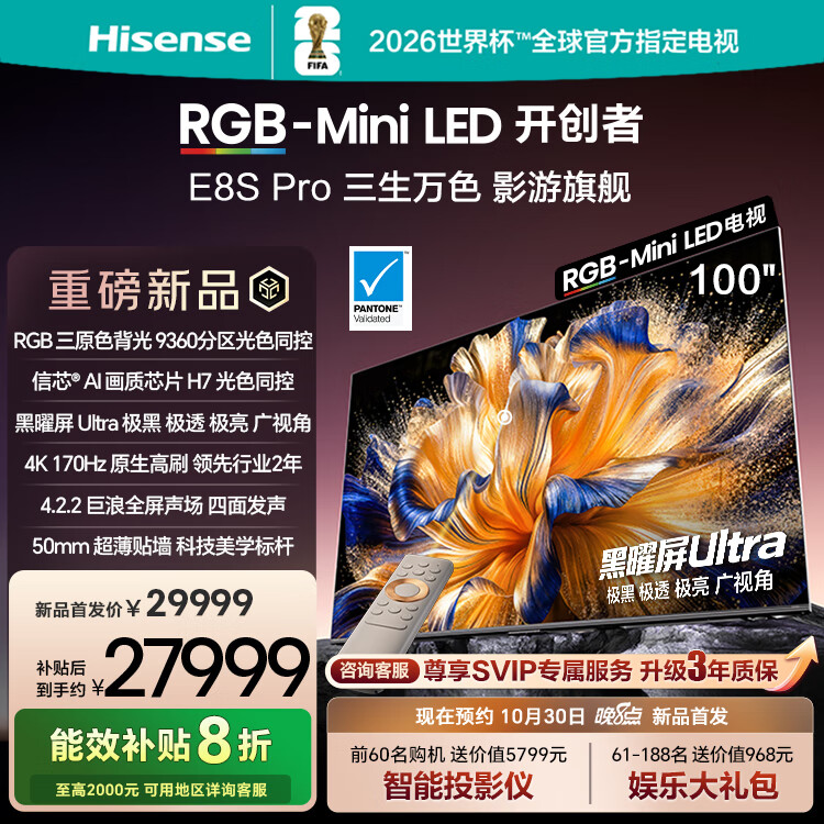 为迎接 2026 电影、3A 游戏、体育大年,海信把全球引领的 RGB-Mini LED 技术应用在影游旗舰 E8 系列上,提前发布 2026 款 RGB-Mini LED 影游机皇 E8S Pro,满足影游玩家升级信仰装备的需求。跨代领先的海信电视 E8S Pro,目前已在京东等各大电商平台开启预约,10 月 30 日晚 8 点将正式开售。