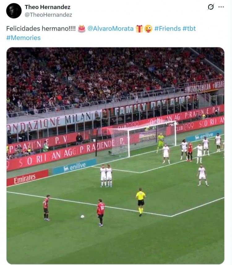 特奥社媒晒出效力米兰期间助攻莫拉塔头球破门的视频,配文:“生日快乐,兄弟!”