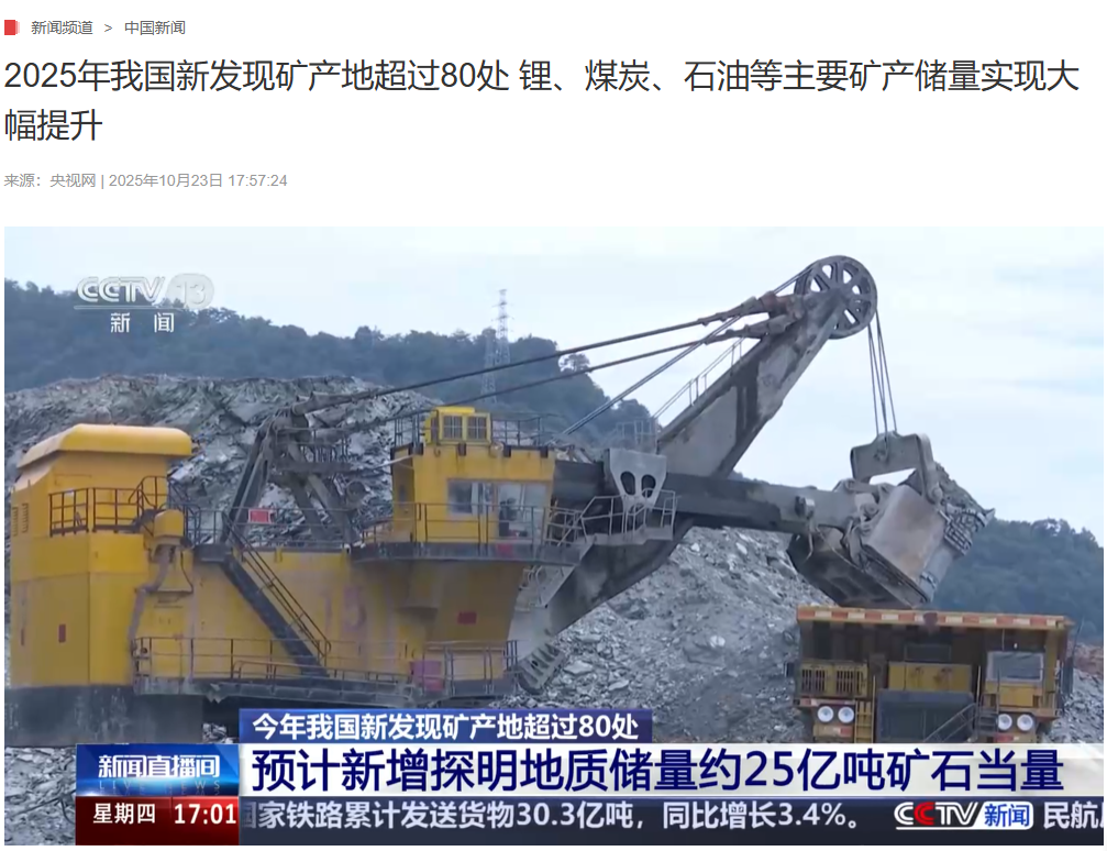 10 月 23 日消息,据央视网记者 10 月 23 日从中国矿业联合会了解到,2025 年,我国新发现矿产地超过 80 处,新增探明地质储量约 25 亿吨矿石当量,同比增长 20% 左右。