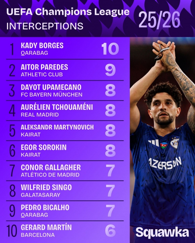 10月23日讯 欧冠第3轮已经完赛,数据机构squakwa统计了本赛季至今的欧冠拦截情况,