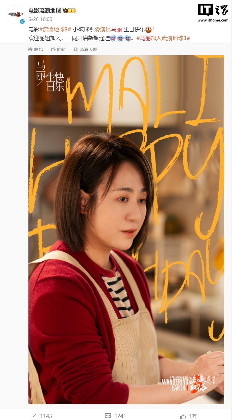 注意到,演员马丽也加入了《流浪地球 3》的拍摄,今年 6 月公布的剧照显示,马丽饰演的角色戴着围裙做饭,似乎和沈腾的角色形成了呼应。