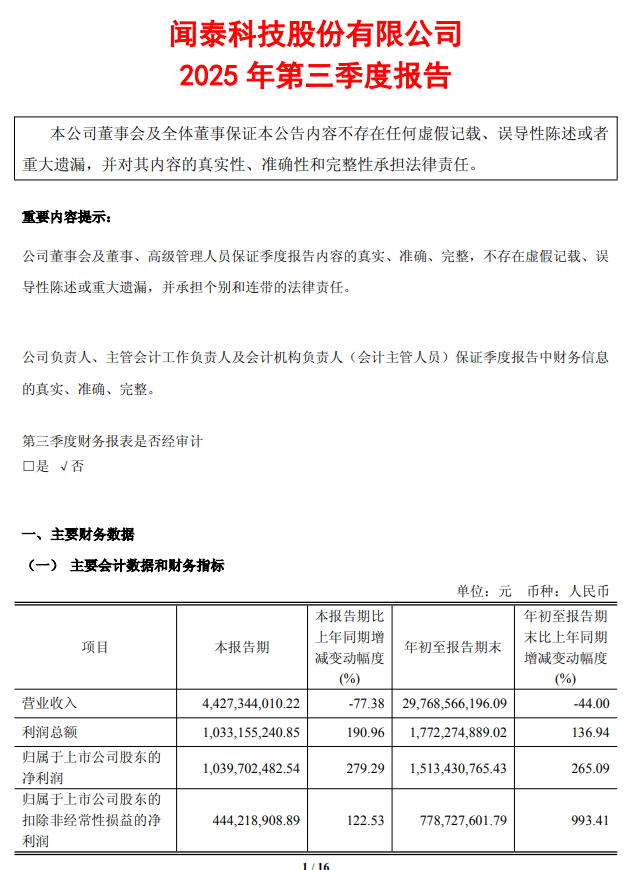 10 月 24 日消息,闻泰科技今晚发布了最新的 2025 年三季度报,第三季度营收为 44.27 亿元,同比下降 77.38%;净利润为 10.4 亿元,同比增长 279.29%。