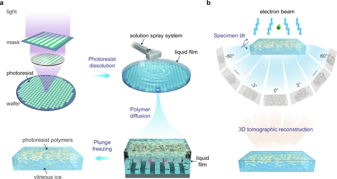 这项突破性研究由北京大学化学与分子工程学院彭海琳教授、高毅勤教授、郑黎明博士联合清华大学王宏伟教授、香港大学刘楠博士等共同完成。研究团队创造性地将原本主要用于生命科学研究的冷冻电子断层扫描(cryo-ET)技术,首次引入半导体制造领域。这项技术的精妙之处在于,它能以极快的速度(超过每秒一万摄氏度)将显影液连同其中的光刻胶分子瞬间冻结在它们的“工作状态”,如同按下时间的暂停键,完整保留了这些分子在液态环境中的真实构象。随后,利用先进的成像和三维重建技术,科学家们成功获得了分辨率优于 5 纳米的光刻胶微观三维“高清全景图”,首次在原位状态下清晰地揭示了光刻胶分子在显影液中的三维结构、界面分布以及相互缠绕(缠结)的行为细节。