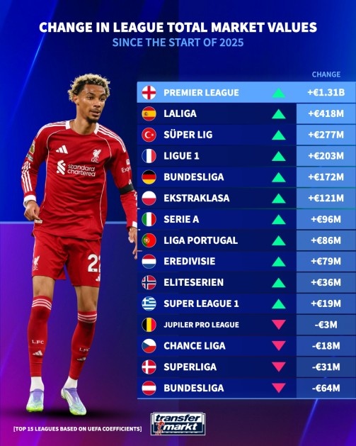 10月25日讯 德国转会市场统计了欧洲各联赛2025年球员总身价的变化,并列出榜单,英超增加13.1亿欧最多,西甲增加4.18亿欧次席。