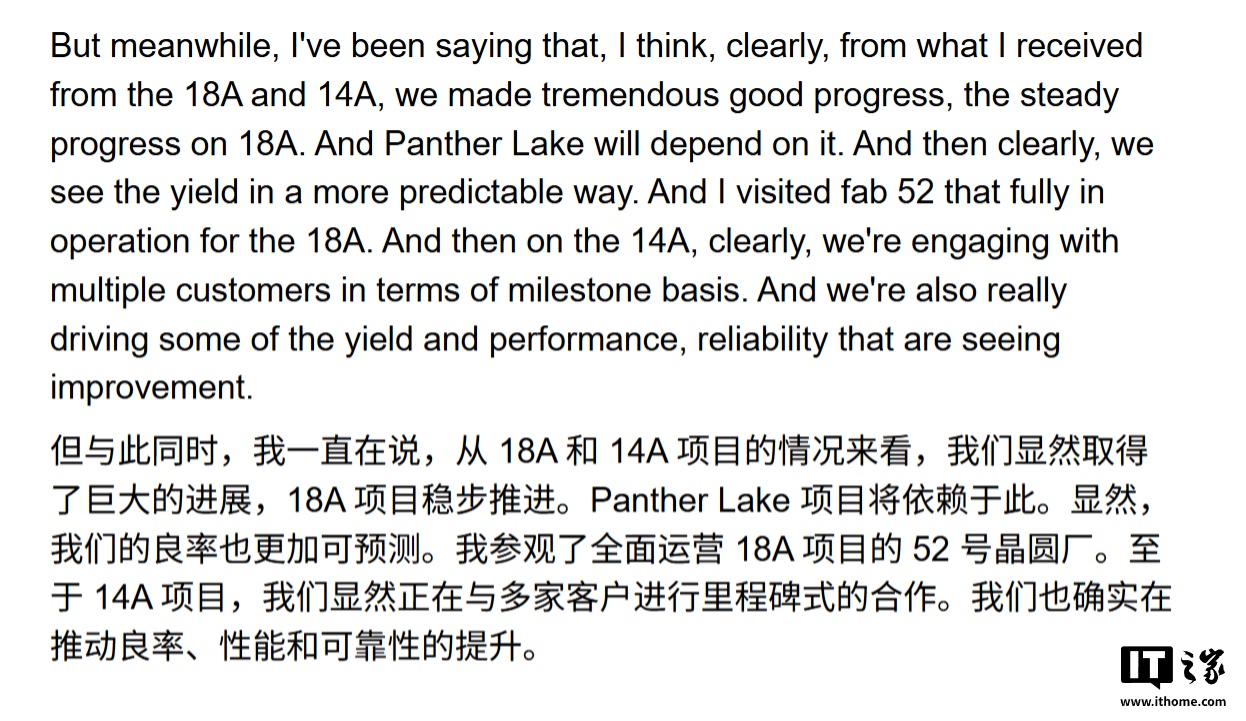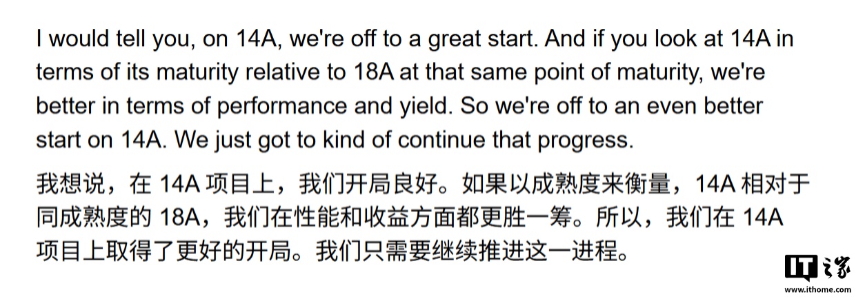 该媒体指出,与主要面向内部产品(如 Panther Lake 处理器)的 18A 节点不同,14A 是一款“侧重于外部客户”的产品,其市场表现将直接决定英特尔能否在高端芯片代工领域站稳脚跟。