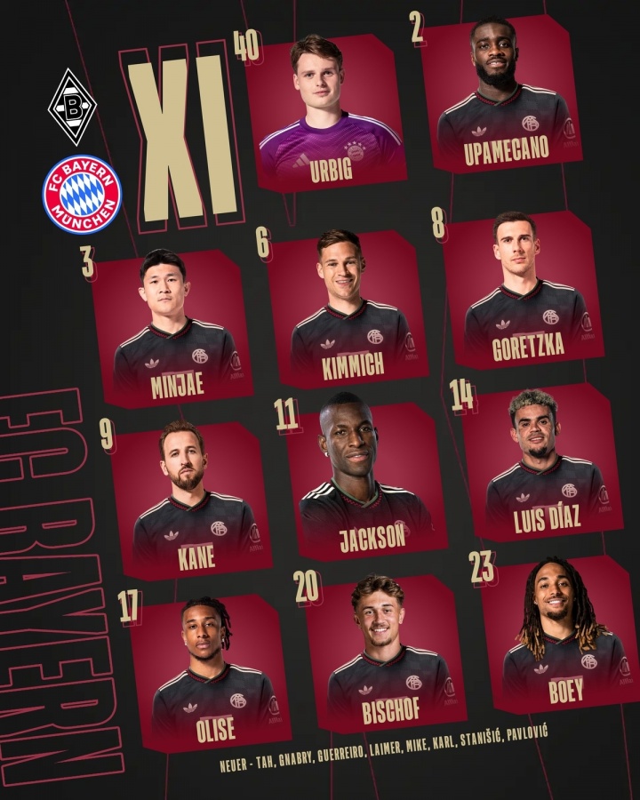 10月25日讯 北京时间今日21点30,德甲第8轮,拜仁客战门兴,赛前首发出炉。拜仁方面