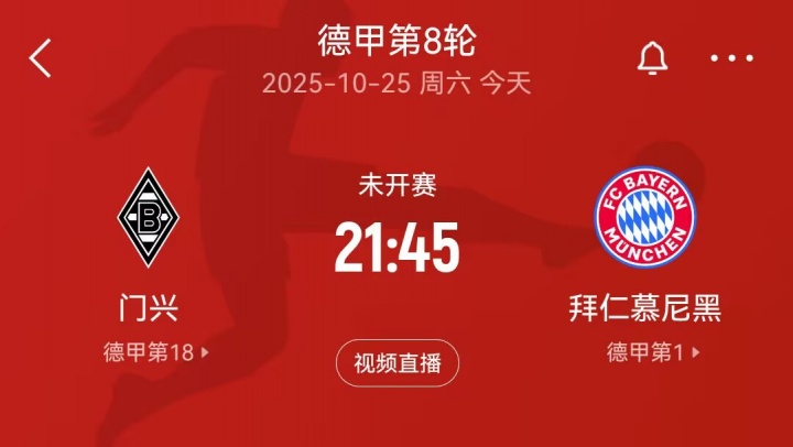 10月25日讯 官方消息,拜仁vs门兴比赛推迟至北京时间21:45开球。