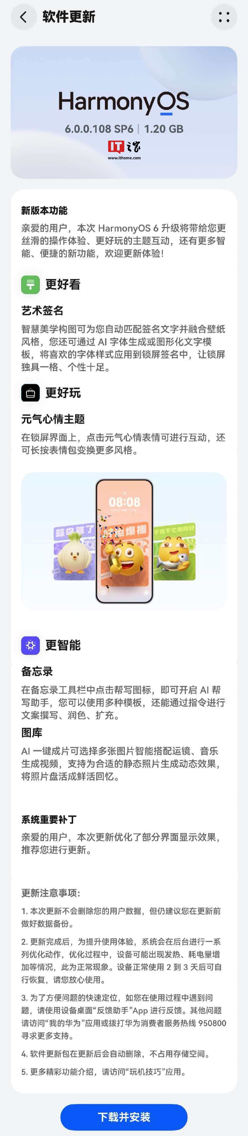 目前,鸿蒙 HarmonyOS 6.0.0.108 SP6 版本已开启推送,系统包大小约 1.20GB。据介绍,本次 HarmonyOS 6 升级将带来更丝滑的操作体验、更好玩的主题互动,还有更多智能、便捷的新功能。