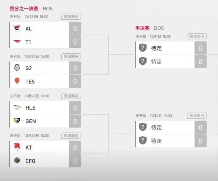 10月26日讯 今日LPL官网再次更新赛程图:上半区(AL半区)半决赛改为11月2日,下半区(KT半区)半决赛改为11月1日。