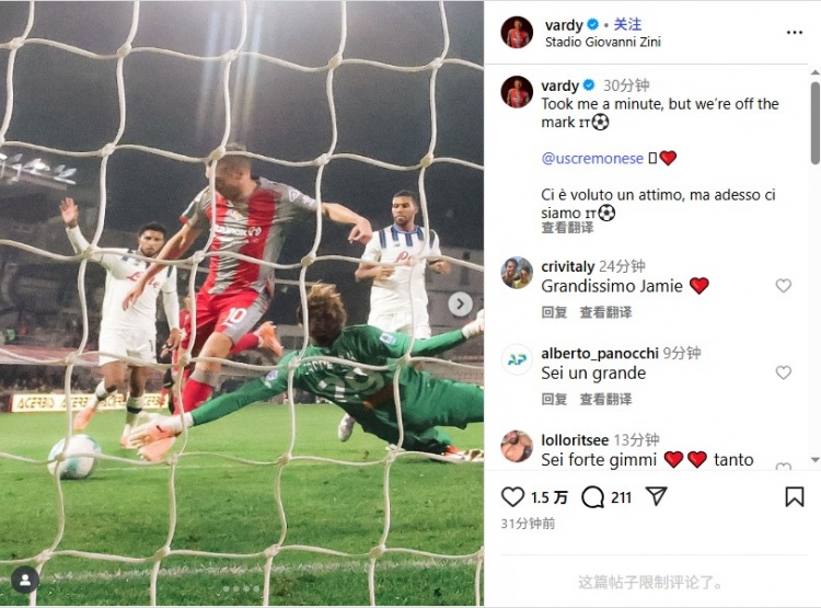 10月26日讯 瓦尔迪今天在Instagram发文,庆祝自己打入克雷莫内塞生涯首球。