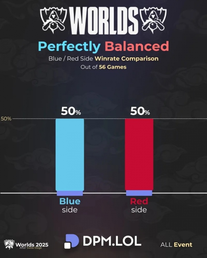 外媒统计世界赛红蓝方胜率:56场比赛中红蓝方胜率均为50%