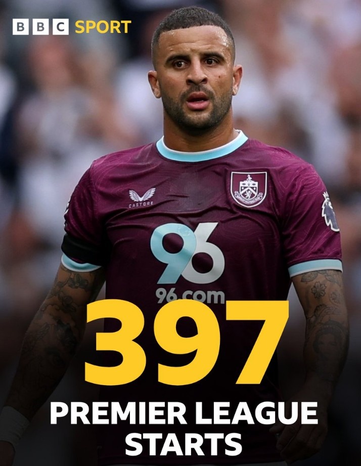 据统计,这是沃克生涯第397次在英超首发出场,追平拜恩斯并列英超历史边后卫球员最多。