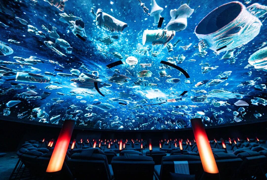 巨型 LED 穹顶。直径 20 米的穹顶、7468 块 LED 模组无缝拼接、近 16K 分辨率、近 400 平方米的连续视觉场域,组成了目前全国博物馆领域规模最大的交互式全景声 LED 穹顶,画面纤毫毕现,抬头就是浩瀚星空和恢宏文物,瞬间代入感拉满。