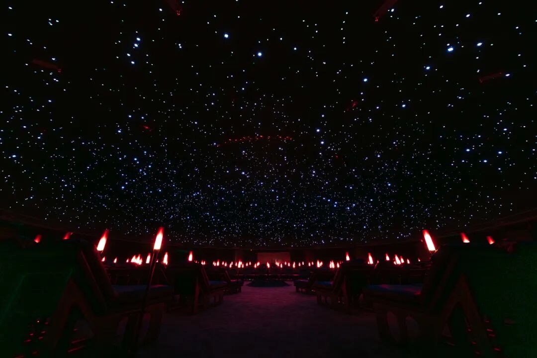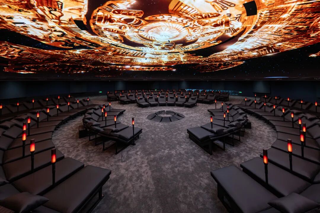 剧场搭载直径 20 米的近 16K 分辨率巨型穹幕、25 通道组成的空间沉浸音响系统与 108 支交互数字火把矩阵,形成融视觉、听觉与交互体验为一体的沉浸场域。