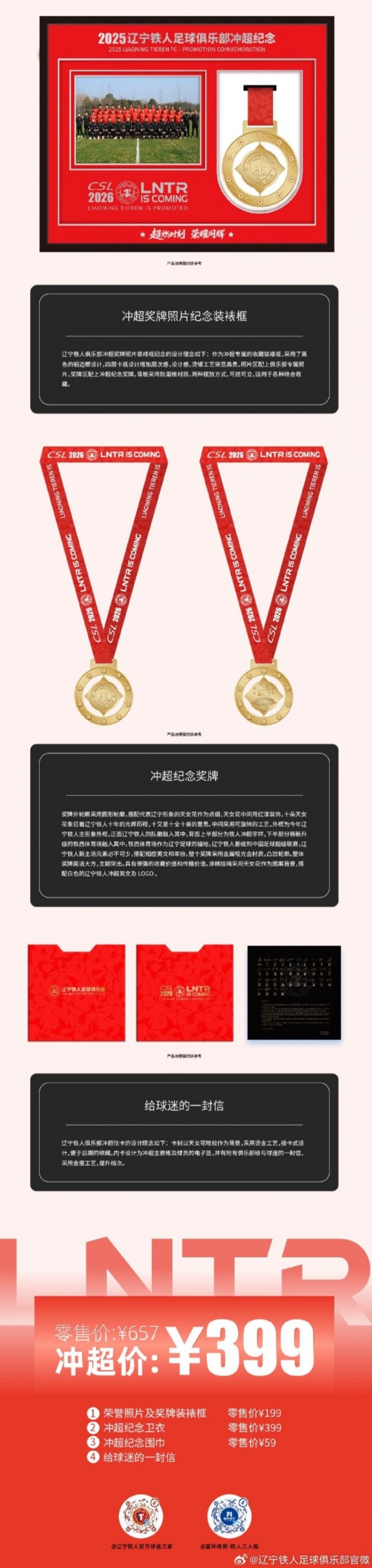 10月27日讯 中甲辽宁铁人官方消息,俱乐部推出冲超纪念礼盒,10月30日14点开售。