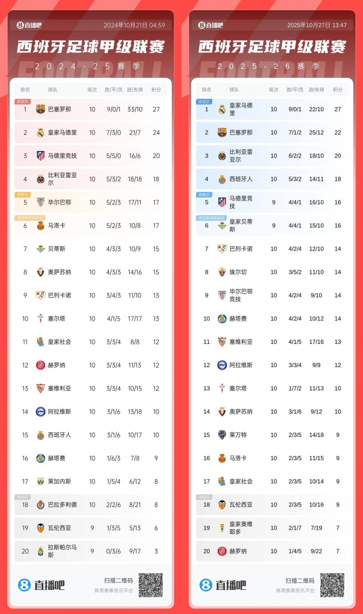 在去年,巴萨同样也是9胜1负开局,他们3分领跑积分榜,第2的则变成了皇马。